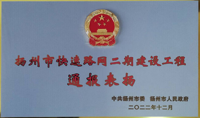 我公司承建的揚州市快速路網(wǎng)二期建設工程獲中共揚州市委、揚州市人民政府通報表揚!